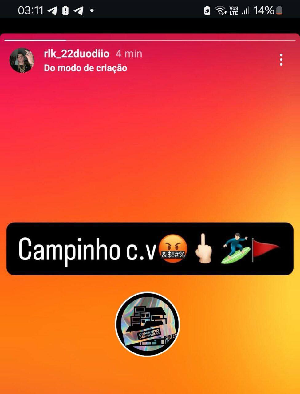 Traficantes do Comando Vermelho festejaram nas redes sociais a tomada do Morro do Campinho. na Zona Norte do Rio que passou ao controle agora da Tropa dovl Urso, Tropa do Tirica e Equipe Caos.