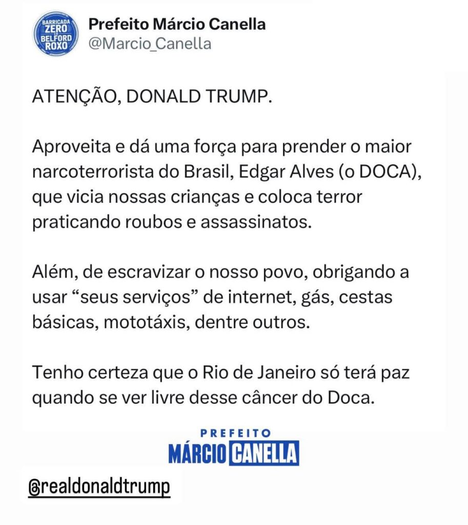 Após o.presidente dos Estados Unidos, Donald Trump.anunciar a captura do presidente da Venezuela, Nicolas Maduro, o prefeito de Belford Roxo, Márcio Canella, usou as redes sociais para pedir ajuda ao chefe do Executivo norte-americanona prisão do traficante Edgar Alves de Andrsde, o Doca, principal líder do Comando Vermelho em liberdade.