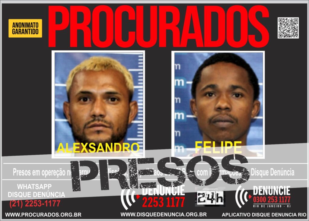 L L Policiais militares prenderam na última quarta-feira, em uma operação na Comunidade do Parque das Missões, em Duque de Caxias, na Baixada Fluminense, dois criminosos, Alexsandro da Silva, de 29 anos e Felipe Moreira da Silva, de 24, membros da Organização Narcoterrorista Comando Vermelho e considerados de Alta Periculosidade pelo sistema carcerário. Na ação foram apreendidos armamentos e uma grande quantidade de entorpecentes, que estavam sendo comercializados na região.  Policiais do Grupamento de Ações Táticas (GAT), realizavam patrulhamento na localidade com o objetivo de coibir o tráfico de drogas e os crimes conexos à traficância, como o roubo de cargas e veículos que costumam ocorrer na região. Durante o cerco, os policiais avistaram dois criminosos, que ao perceberem a aproximação da viatura policial, empreenderam fuga. Foi iniciado cerco na área, e a guarnição conseguiu localizar ambos, que estavam em posse dos seguintes materiais que apreendidos: 01 pistola Beretta APX, cal. 9mm, numeração suprimida; 01 carregador de pistola cal. 9mm; 06 munições intactas cal. 9mm; 01 pistola Taurus G2C, cal. 9mm, numeração suprimida; 01 carregador de pistola cal. 9mm; 12 munições intactas cal. 9mm; 02 rádios transmissor; 02 cintos de guarnição; 371 trouxinhas de maconha; 242 pinos de cocaína e 367 pedras de crack. Todos os materiais arrecadados, bem como os detidos, foram conduzidos à sede da 59ª DP (Duque de Caxias), para os procedimentos de praxe, onde foi constatado um mandado de prisão, em desfavor de Alexandre da Silva, pelo crime de tráfico de drogas. Os acusados também foram autuados pelo crime de associação para o tráfico e tráfico de drogas, e permaneceram presos e todo o material ficou apreendido, sendo que após os trâmites legais, eles foram conduzidos a uma unidade prisional da SEAP/EJ, onde já estão acautelados à disposição da Justiça.  FONTE: Disque Denúncia RJ