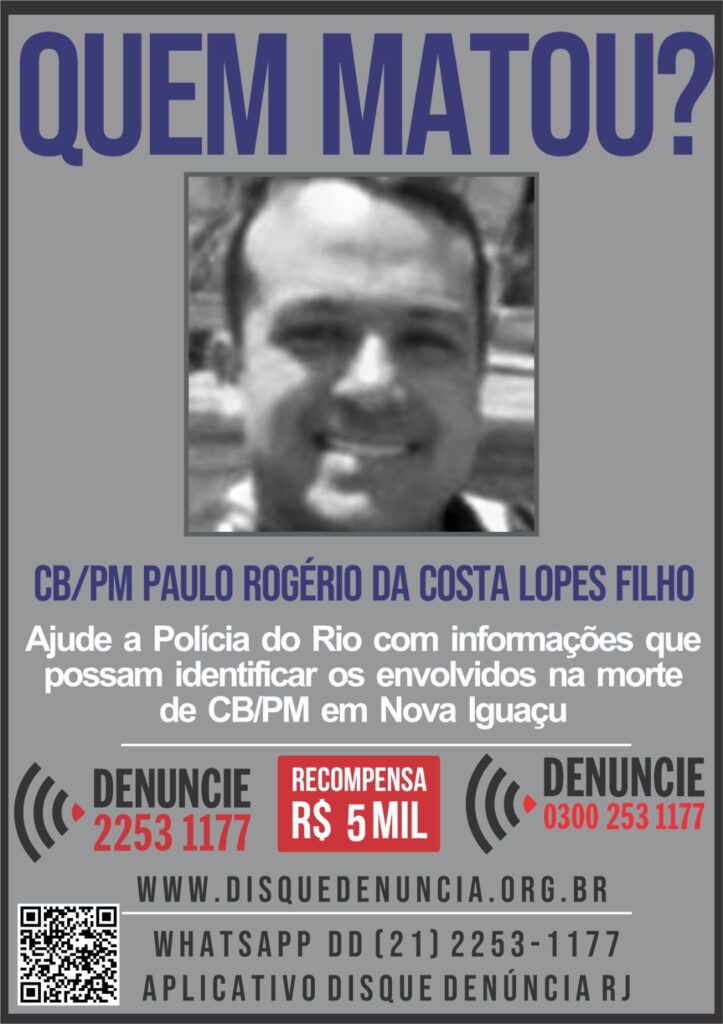 O Disque Denúncia (2253-1177) divulga, neste domingo (10), um cartaz com título – Quem Matou? – para auxiliar no inquérito policial instaurado pela Delegacia de Homicídios da Baixada Fluminense (DHBF), a fim de obter informações que levem à identificação e prisão dos envolvidos na morte do cabo da Polícia Militar do Rio de Janeiro, Paulo Rogério da Costa Lopes Filho, de 35 anos, chegou a ser socorrido, mas não resistiu aos ferimentos, após um tentativa de assalto. O pai do PM, P.R.C.L. de 63 anos, também foi baleado na ocasião e morreu. Lotado no 9º BPM (Honório Gurgel), o crime ocorreu na manhã deste domingo (10), na Avenida Severino Pereira da Silva, no Cabuçu, em Nova Iguaçu, na Baixada Fluminense. Segundo informações da Secretaria de Estado de Polícia Militar (SEPM), policiais do 20º BPM (Mesquita) foram acionados para verificar uma ocorrência com disparos de arma de fogo. No local, testemunhas relataram que duas vítimas, o policial e seu pai, haviam sido baleadas e socorridas à UPA de Cabuçu. De acordo com informações, os dois foram surpreendidos por cinco criminosos armados, que desceram de um carro e cercaram o veículo onde pai e filho estavam. As câmeras de segurança do local registraram o momento da abordagem. Os bandidos anunciaram o assalto, e após uma rápida reação dispararam várias vezes contra as vítimas antes de fugir sem levar nada. As diligências estão em andamento, e agentes da DHBF estão ouvindo testemunhas e buscando informações nas câmeras de segurança, que possam identificar os autores do crime e sua motivação. Quem tiver informações sobre sobre a localização dos envolvidos na morte do agentes de segurança, favor denunciar pelos seguintes canais de atendimento do Disque Denúncia do Rio: Central de atendimento/Call Center: (021) – 2253 1177 ou 0300-253-1177WhatsApp Anonimizado: (021) – 2253-1177 (técnica de processamento de dados que remove ou modifica informações que possam identificar uma pessoa)Aplicativo: Disque Denúncia RJAnonimato Garantido