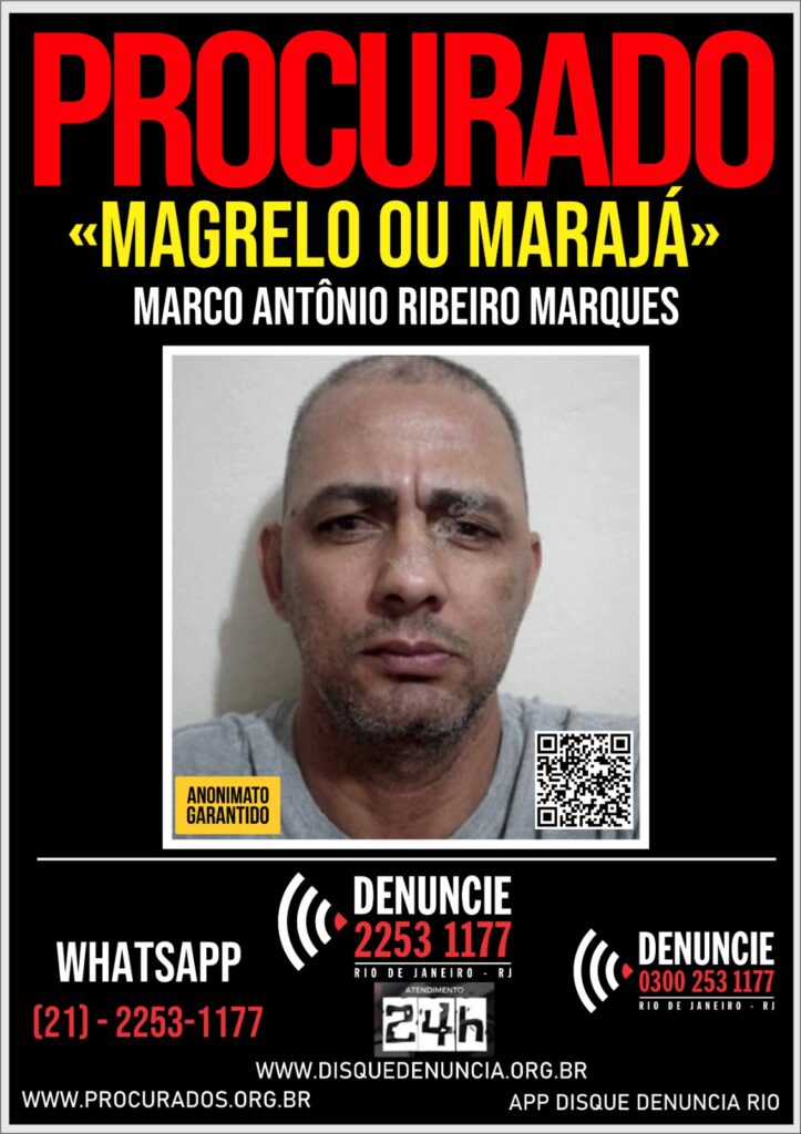 O Disque Denúncia (2253-1177) divulga, nesta terça-feira (30), um cartaz para auxiliar nas investigações e no inquérito instaurado pela 143ª DP (Itaperuna), a fim de obter informações que levem à localização e prisão do criminoso, membro da Organização Criminosa Terceiro Comando Puro (TCP), Marco Antônio Ribeiro Marques, vulgos “Magrelo ou Marajá”, de 53 anos. Ele seria o principal suspeito de ordenar um duplo homicídio, ocorrido em Itaperuna, no Noroeste Fluminense, onde pai e filha foram executados por vingança em guerra entre facções rivais. Consta nos autos que, na madrugada do sábado dia 06/09/2025, a equipe policial tomou ciência de um duplo homicídio consumado e de uma tentativa de homicídio, por disparos de arma de fogo, ocorridos na Rua Manoel Roberto de Oliveira, nº 630, bairro Carulas. As vítimas foram identificadas como Jéssica Carla Moraes Rosa, de 26 anos, e seu pai José Carlos da Costa Moraes, de 55 anos. Segundo investigações, dois criminosos foram até o endereço e ordenaram que as vítimas saíssem de casa. Elas foram obrigadas a ficar de joelhos e, em seguida, foram executadas, horas depois que três homens, ligados ao TCP, terem sido mortos a tiros em um primeiro ataque, na sexta (05), na Rua Cândido Freitas Bastos, no bairro Matinada. Uma terceira vítima, L.G.M.S, sofreu disparos na cabeça e perna, sobreviveu, e reconheceu Diego de Oliveira Cuba, vulgo “Bebel”, de 18 anos, como sendo o autor dos disparos, e Rafael Costa da Conceição, vulgo “Pastorzinho” ou “Pé Sujo”, de 20, como aquele que portava o celular durante a chamada de vídeo e auxiliou na execução. Os dois já estão presos. Segundo os policiais, os crimes estariam relacionados à guerra entre as facções TCP e CV, mais precisamente como vingança pelo homicídio de Santiago Ribeiro Marques, irmão de Marco Antônio o “Magrelo”, que seria o líder do TCP no bairro Matinada, ocorrido na noite anterior (05/09/2025). Como os rivais da facção do CV, [dois irmãos] não foram encontrados, por não mais residirem no local, “Magrelo”, deu ordem de execução aos familiares dos rivais. Ainda segundo investigações, pai e filha, não tinham envolvimento com o tráfico de drogas. Diante dos fatos, a Autoridade Policial da 143ª DP (Itaperuna), requereu junto à Justiça um mandado de prisão, que deferido pela 2ª Vara Criminal de Itaperuna, Espécie de prisão: Preventiva, pelos crime de Homicídio Qualificado (2 vezes) C/C Crime Tentado, Associação Criminosa. O Disque Denúncia, solicita que quem tiver informações sobre a localização de Marco Antônio, o “Magrelo”, favor entrar em contato pelos seguintes canais de atendimento: Central de atendimento/Call Center: (021) – 2253 1177 ou 0300-253-1177WhatsApp Anonimizado: (021) – 2253-1177 (técnica de processamento de dados que remove ou modifica informações que possam identificar uma pessoa)Aplicativo: Disque Denúncia RJAnonimato Garantido
