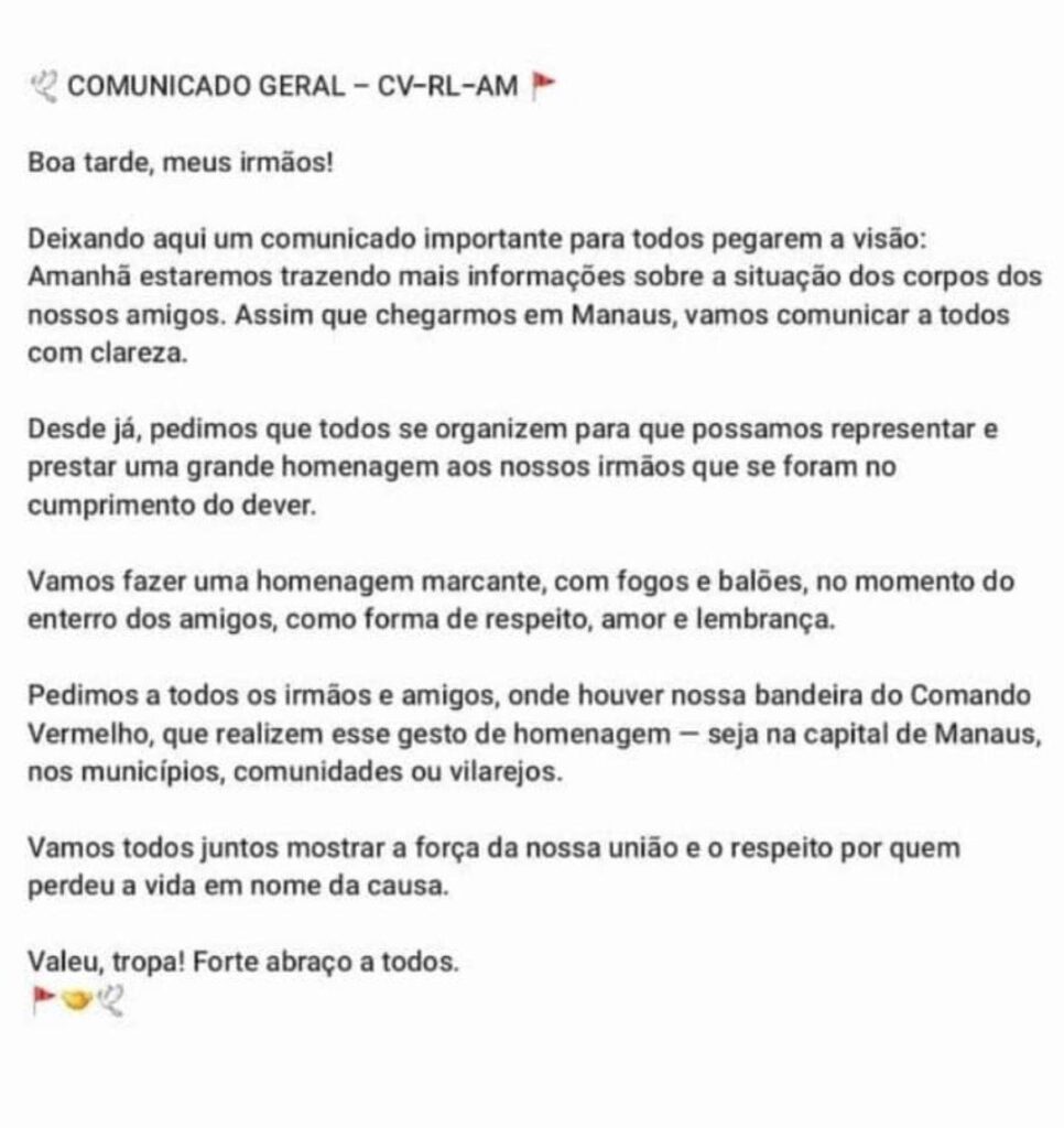 Segundo a Polícia Civil do Rio, dos 117 suspeitos mortos na operação nos complexos do Alemão e da Penha, 99 foram identificados, 42 tinham mandados de prisão e 78 possuíam revelância no crime organizado respondendo a diversos delitos como homicídios, tráfico de drogas, organização criminosas e roubos. Dos 117 traficantes mortos, 40 eram de outros estados sendo 13 do Pará, sete do Amazonas, seis da Bahia, quatro do Ceará, um da Paraíba, quatro de Goiás, um do Mato Grosso e três do Espírito Santo. O secretário da Políica Civil,, Felipe Curi, afirmou que as restrições da ADPF das Favelas que restrinigiu as operações em comunidades permitiu o deslocamento de criminosos de outros estados para o Rio de Janeiro. Segundo ele, os complexos do Alemão e da Penha eram QGs do CV no Rio mas agora viraram centros de decisão da facção em nivel nacional. Bandidos de fora são treinados nestas comunidades. Recebem treinamento de tiros, manuseio de armamentos, táticas de guerrilha e retonaram para os seus locais de origem para espalhar a cultura da facção. Curi disse que as UPPs permitiram a expansão do tráfico para outros locais do estado como Região dos Lagos, Baixada Fluminense, Região Serrrana e Costa Verde. Curi disse ainda que os complexos do Alemão e da Penha viraram centros de distribuição de armas e drogas para comunidades do Rio. Por mês, são negociadas cerca de 10 toneladas de drogas e de 50 a 70 fuzis. As apurações indicam que pelo menos 24 comunidades do Rio de Janeiro — entre elas o Complexo do Salgueiro, em São Gonçalo, a Rocinha, o Complexo da Maré, o Jacarezinho e o Complexo do Lins — são diretamente abastecidas por esses fluxos ilícitos. A Polícia Civil está finalizando um documento de inteligência com centenas de páginas, que reúne a qualificação dos criminosos mortos e uma análise detalhada sobre o papel estratégico dos complexos da Penha e do Alemão dentro da estrutura da organização criminosa. Entre os paraenses mortos na Operação Contenção foram Lucas da Silva Lima (“LK”), Jhonata de Lima Albuquerque (“Turista”), Gilberto Nascimento (“Bigodinho”), Nailson Miranda (“Mujuzinho”), Ednelson da Silva Abreu (“Caboco”) e Wesley Martins e Silva, todos já com passagem pelo sistema de segurança pública do Pará. FONTE: Polícia Ciivl do RJ