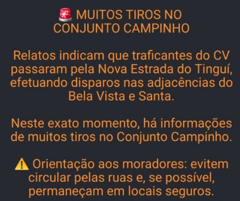 Relatos nas redes sociais apontam que na noite de ontem houve muitos disparos de armas de fogo em localidades de Campo Grande, na Zona Oeste do Rio. Segundo a página Campo Grande ao vivo, os tiros teriam sido disparados na Estrada do Tingui no trecho da Bela Vista e Santa Rosa. De acordo com a página, houve disparos também no Conjunto Campinho. A ação foi atribuída a traficantes do Comando Vermelho que vêm fazendo sucessivos ataques contra milicianos que atuam na região. Moradores do Santa Rosa, Bela Vista, Vila Ieda, Novo Horizonte e adjacências, estão apavorados com a quantidade de tiros nas adjacências. Um pessoa foi executada e teve o corpo levado no valão do Bela Vista, segundo boatos de moradores. Segundo informações: vários membros do CV passaram por vários sub-bairros dando tiros para o alto. Em breve, vamos atualizar com a prévia do batalhão local e se essa informação procede. Fique dentro das suas casas, por favor. Clima de medo na região.”Um pessoa foi executada e teve o corpo levado no valão do Bela Vista, segundo boatos de moradores. Segundo informações: vários membros do CV passaram por vários sub-bairros dando tiros para o alto. Fique dentro das suas casas, por favor. Clima de medo na região, diz postagem da página. Veja vídeo https://www.instagram.com/p/DT6RaBfEWKt “Eu indo pra casa nesse momento pedindo a Deus proteção”. disse uma moradora.