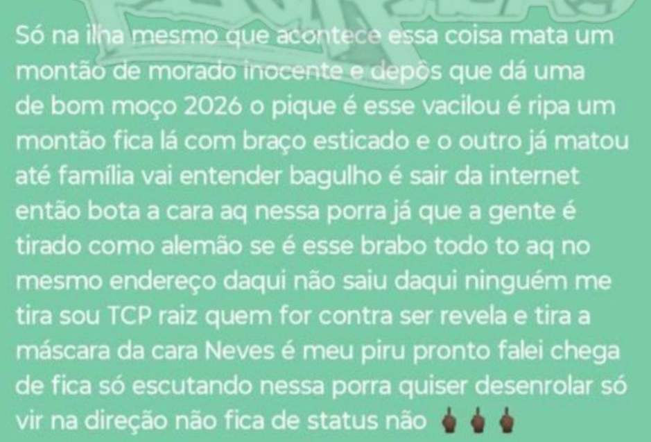 Postagens em redes sociais apontaram para novas trocas de farpas entre os dois principais chefes do Terceiro Comando Puro na Ilha do Governador: os traficantes Neves, que comanda o Morro