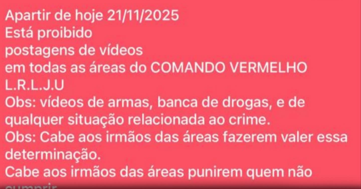 “Está proibida a postagem de vídeos em todas as áreas do Comando Vermelho — L.R.L.J.U. Obs.: vídeos de armas, bancas de drogas ou qualquer situação relacionada ao crime.