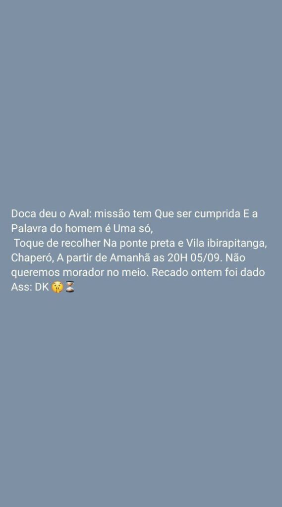 Pelas redes sociais, eles falam em toque de recolher e que a ordem partiu do traficante Doca do Complexo da Penha.