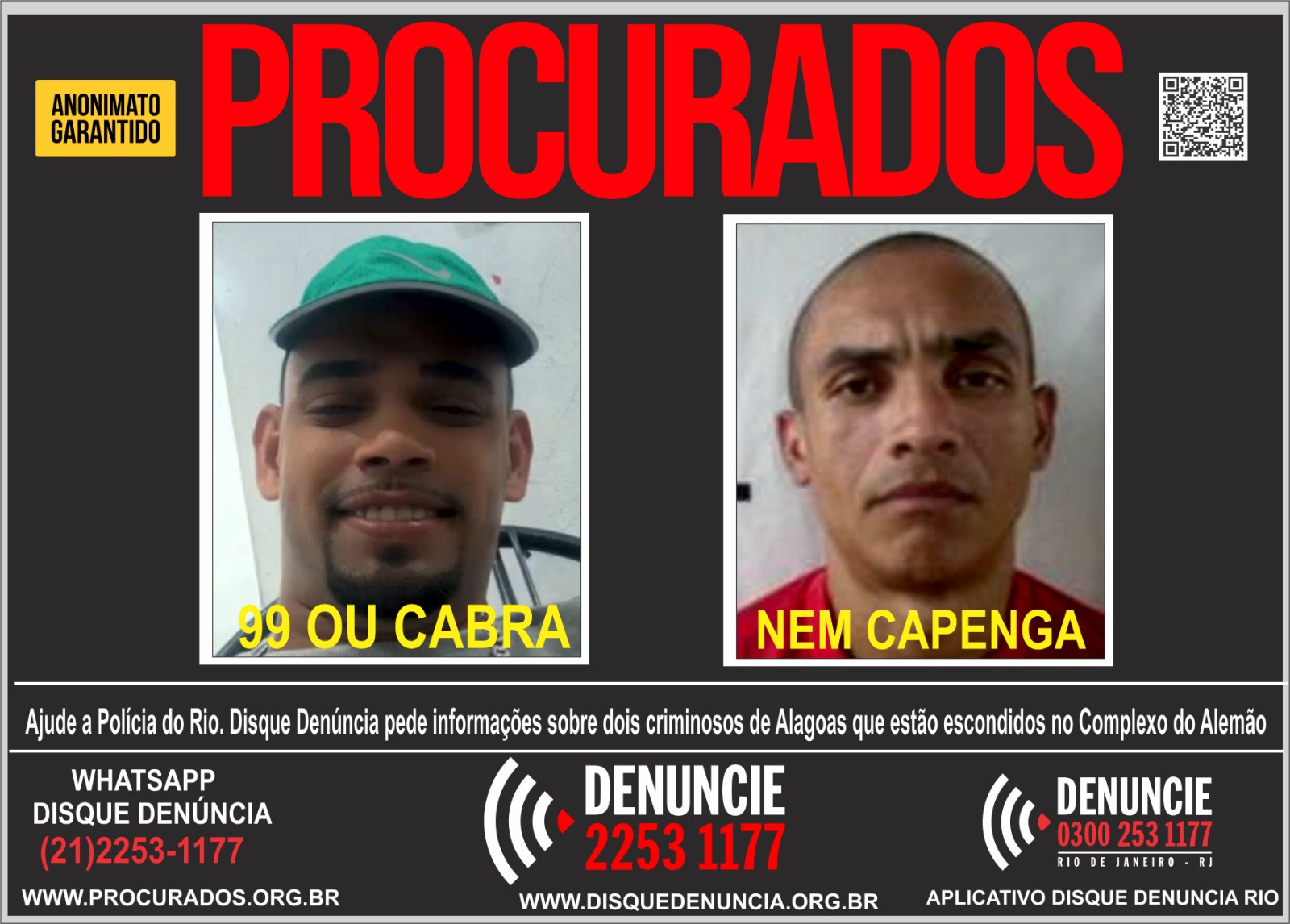 A força-tarefa integrada que une a Secretaria de Estado da Segurança Pública, o Grupo de Atuação Especial de Combate ao Crime Organizado (GAECO) do Ministério Público Estadual, a Polícia Civil, por meio da Diretoria de Repressão à Corrupção e ao Crime Organizado (Draco), e a Polícia Militar do Estado de Alagoas e as Forças de Segurança do Rio busca informações que levem à prisão dos criminosos Kayo Nascimento de Magalhães, conhecido pelos vulgos de 99 ou Cabra ou Rafinha”, de 25 anos e José Emerson da Silva, vulgo “Nem Capenga”, de 41 . Todos dois são ligados a Organização Criminosa Comando Vermelho, que atua no Estado de Alagoas,