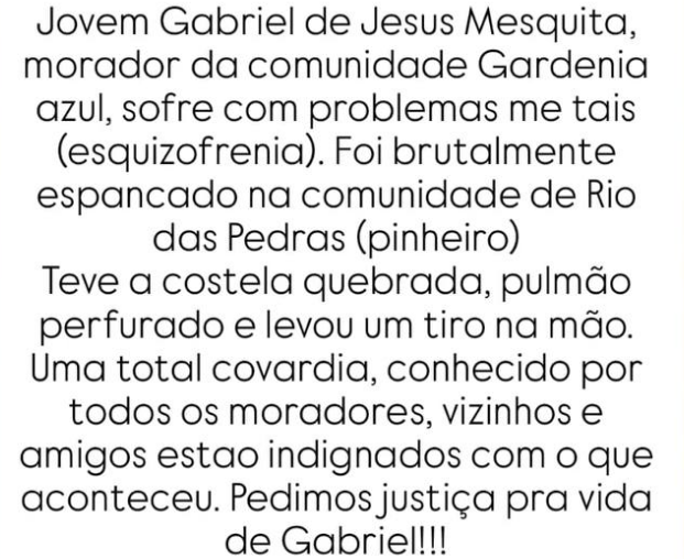 Um jovem conhecido como “Gabriel”, morador da Comunidade do Gardênia Azul (CV), que sofre com problemas mentais, foi brutalmente espancado na localidade do Pinheiro (Milícia), em Rio das Pedras (Milícia).