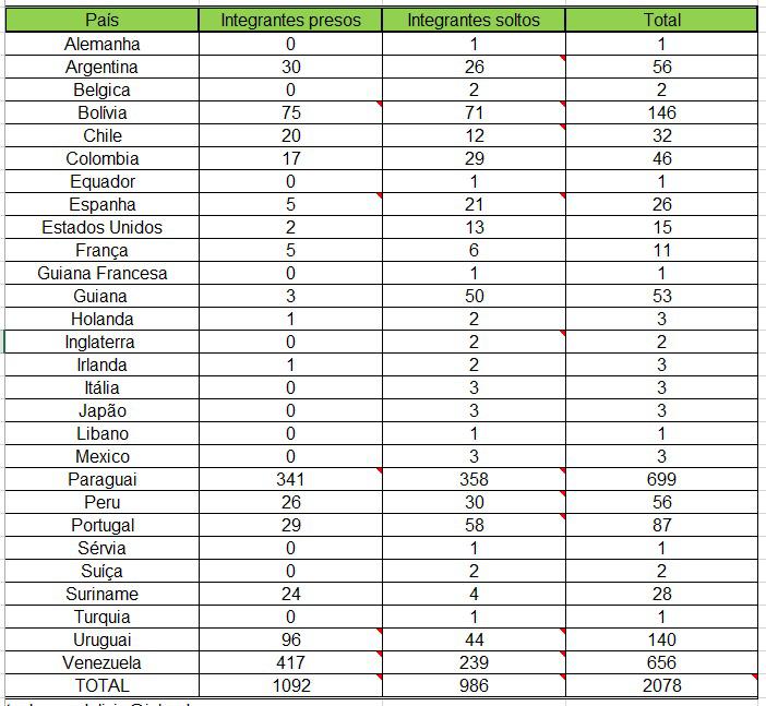 O Paraguai é o país de fora que contaria com mais participantes da facção: 699, seguido da Venezuela, com 656.