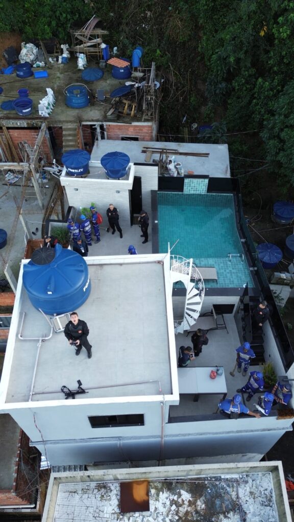 Já no segundo imóvel, situado em um edifício de sete andares, havia uma piscina com cascata e uma parede falsa, que funcionava como túnel e dava acesso à mata. No edifício, os agentes também localizaram uma área de lazer, que continha piscina e churrasqueira. Toda a área foi demolida.