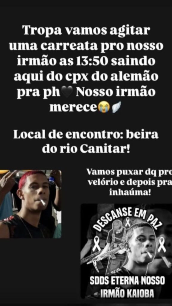A carreata vai começar no Complexo do Alemão (CV) e ir para o Complexo da Penha (CV) para o velório de Kaioba, Logo após Isso vão seguir em direção a Inhaúma.